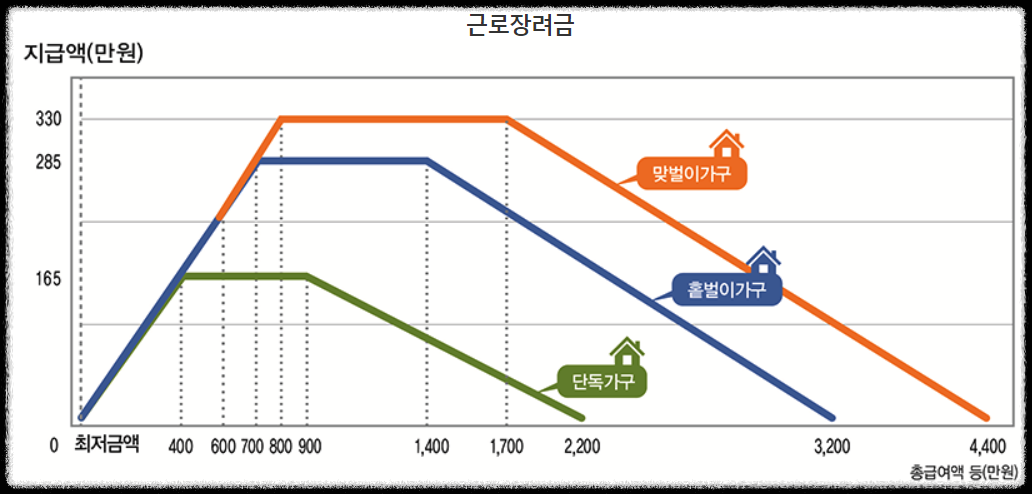 근로장려금 지급액은 가구 유형과 소득에 따라 다릅니다.